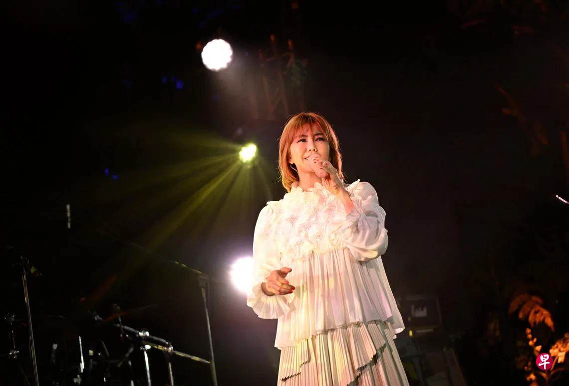 陈洁仪与观众合唱耳熟能详的《家》。(樟宜机场集团提供)孙燕姿和陈洁仪各自演唱代表作《逆光》《遇见》《一起走到》,以及《喜欢你》《家》,引来全场观众齐声合唱,掌声雷动,现场情绪非常高昂。当孙燕姿唱起2002年国庆主题曲时,观众欢呼声达到高潮,为整场演唱会画下圆满句号。