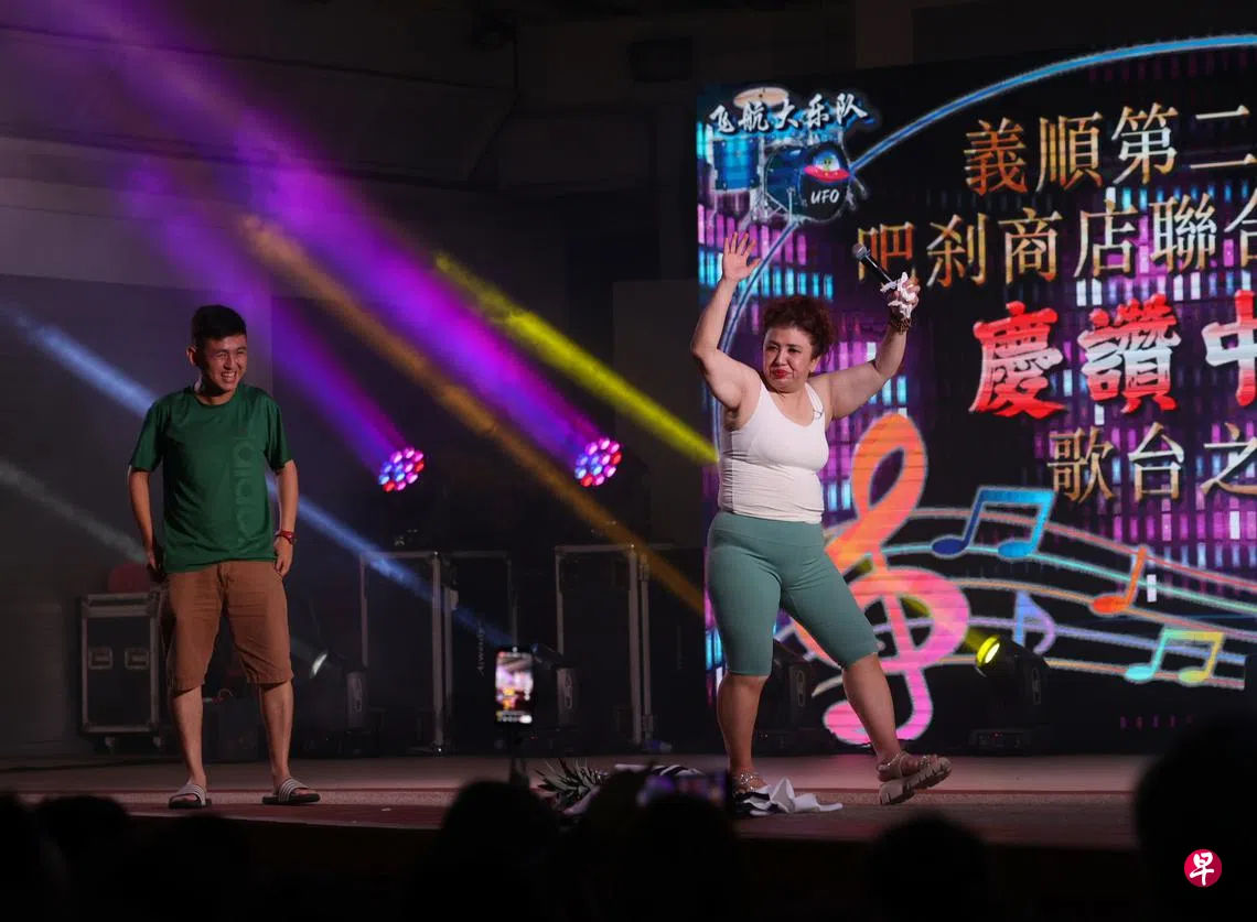 (新加坡讯)“歌台一姐”刘玲玲到义顺主持歌台,现场座无虚席,她使尽浑身解数,露肚腩唱《舞女》,与年轻男观众互动,甚至作势亲吻,引全场爆笑。