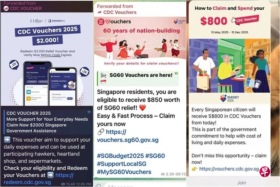 《联合早报》报导,新加坡警察部队今日发文告指相关受害者,一般会收到带有图文的信息,诱导他们通过假冒政府的Telegram频道(如“CDC Vouchers”)或Instagram账号(如“govh.sg”),领取SG60或社区发展理事会邻里购物券。