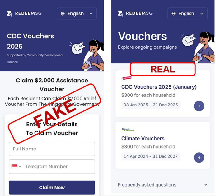 一般而言,民众通过go.gov.sg/sg60v或go.gov.sg/cdcv领取SG60或社区发展理事会邻里购物券后,才会收到名为“gov.sg”的短讯,内含一个专属链接。民众过后须通过Singpass登录验证,无须提供额外信息。