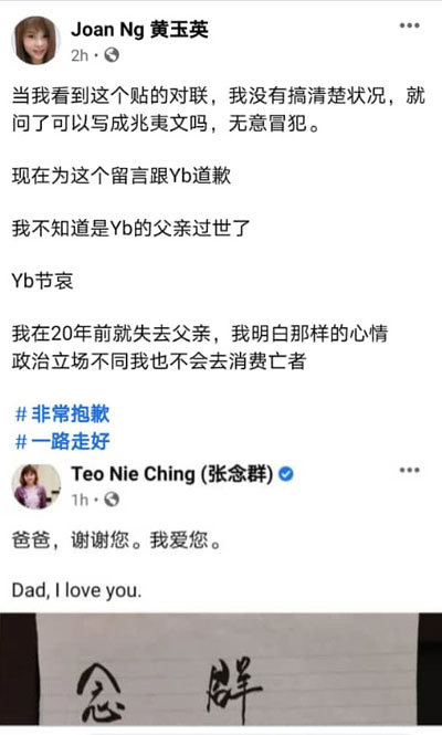 黄玉英过后也在个人面子书发贴解释看到张念群贴出的对联时,没搞清楚状况,就问了可以写成瓜夷字吗,无意冒犯,并向张念群道歉。