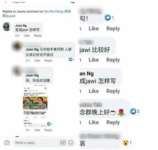 黄玉英看到这则贴文时,在该贴文下方留言“jawi怎样写”,结果遭网民围剿,指她“狗嘴长不出象牙”、“消遣往生者”等。