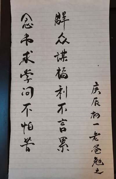 张念群昨晚在面子书贴出一张父亲张敬良以其名字提字的对联照片,并写上“爸爸,谢谢您。我爱您”字句。